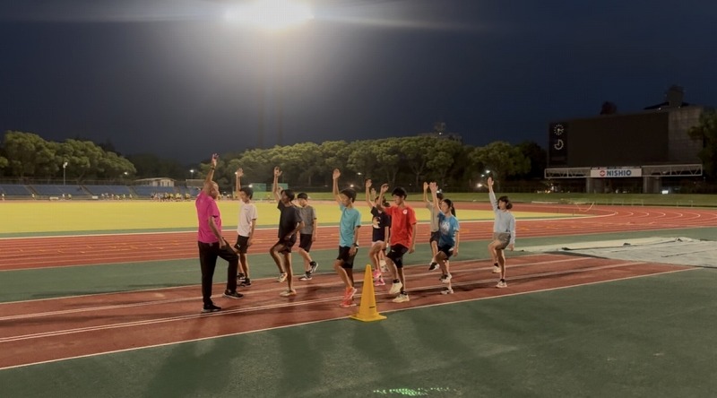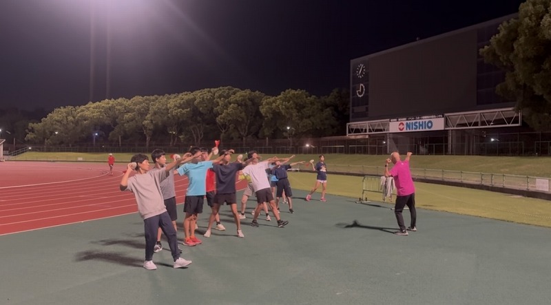 中学生クラス ジャベボール投げをしているところです。 投動作の確認とステップ練習をしているところです。