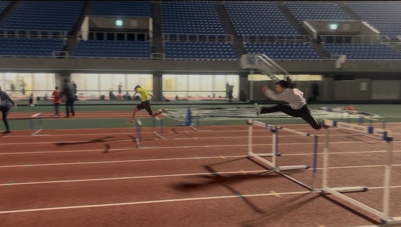 高学年クラス ハードル走をしているところです。 今日の課題は「自分に適した踏み切り足を見つけること」でした。