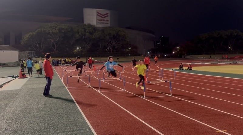 高学年クラス ハードル走をしているところです。 3歩のリズムで跳べるようになってきたので、自分に合ったインターバルを探しました。