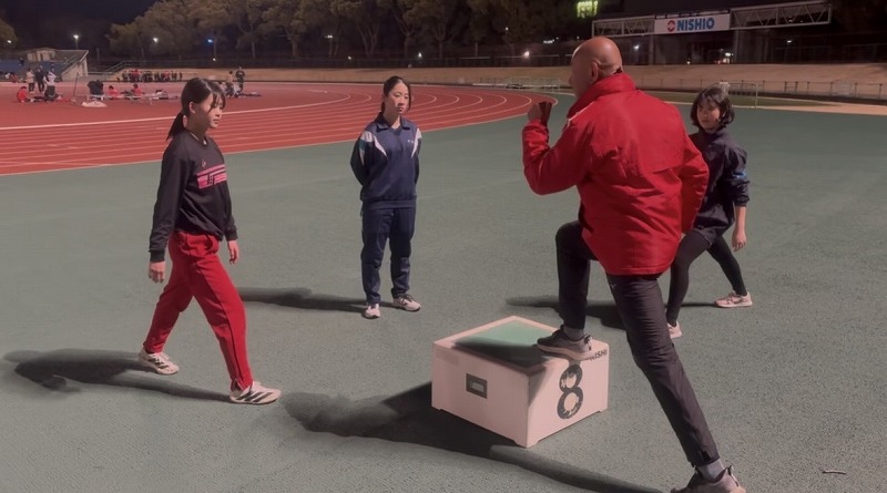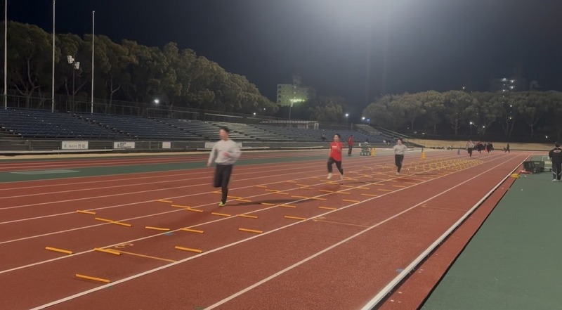 中学生クラス スプリントドリルをしているところです。 重心の位置を意識しながら取り組みました。