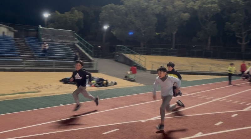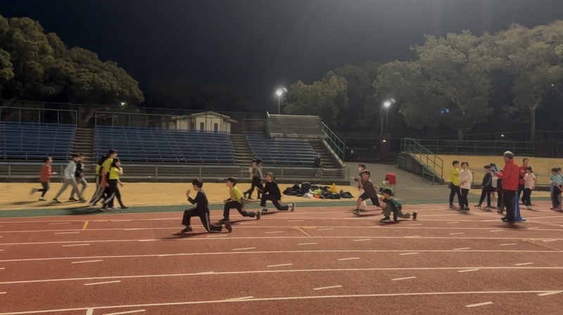 低学年クラス スタート練習をしているところです。 コーチのスタート合図に合わせて、素早く走りだす意識で練習に取り組みましました。