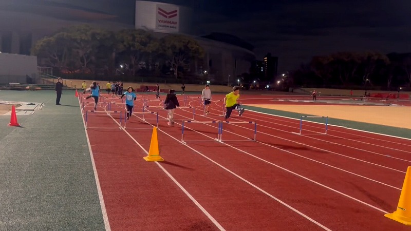 高学年クラス シャトルハードルをしているところです。 折り返してからがしんどいところですが、最後まで走りきることができるようになってきました。 ←左の写真をクリックして下さい。